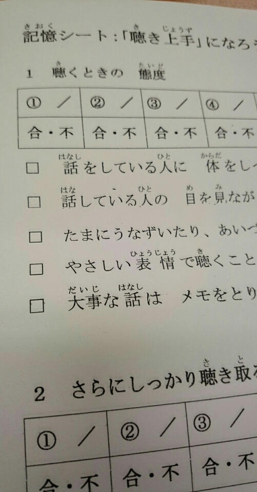 まずは、話を聴くときの大事なポイントをプリントで覚えてもらいます。