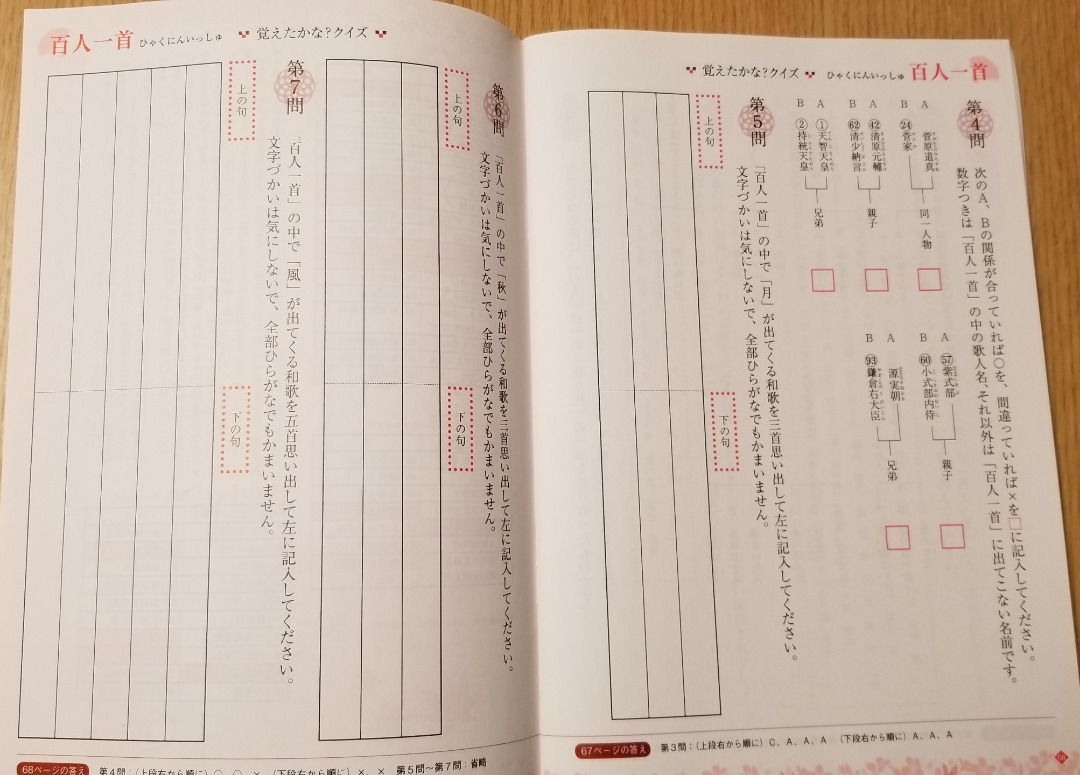 うちでは使いませんでしたが、ダイソーで面白いテキストを見つけました。「書いて覚える百人一首」。