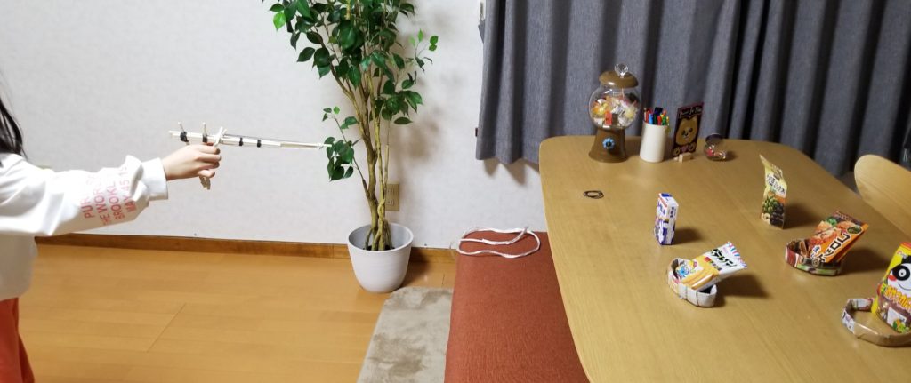 輪投げと射的で盛り上がります。景品以外は敢えて買わずに手作りしたようですが、なかなかの完成度でしたよ。