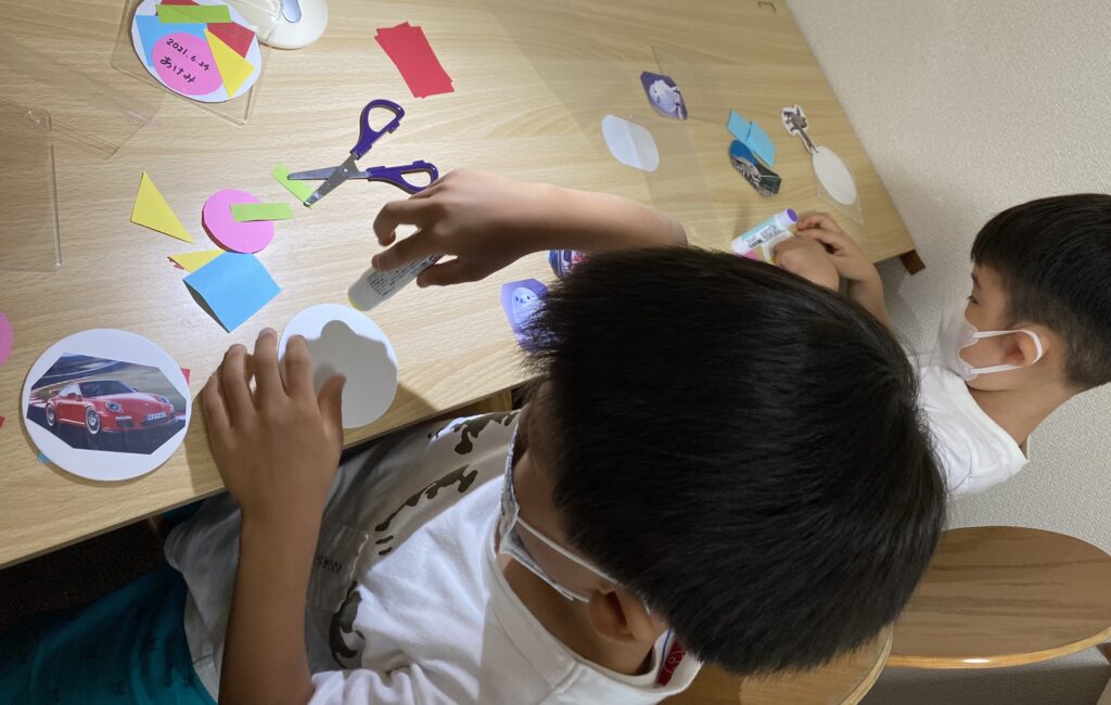 制作の時間では「コースターホルダー」を作りました。表はそれぞれ好きな写真を貼り、裏は次の条件で作ってもらいます。