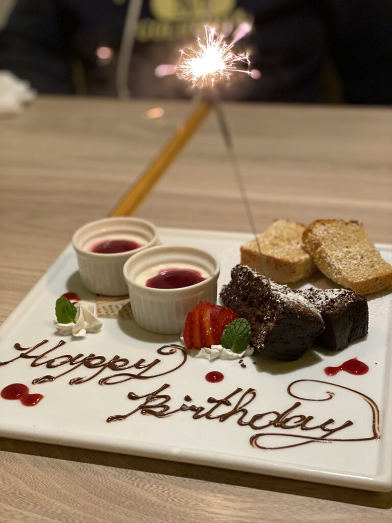 食後に店員さんが「お誕生日おめでとうございます!!」と、サプライズのデザートプレートを持ってきてくれました。今年もダンナが予約時にこっそりとお願いしたようです。最後まで隠し切れずに、ちょこちょこと匂わせてしまうため、サプライズ…とは言い難いのですが(笑)、ダンナの表情はいつも喜色満面の「してやったり」顔。それを見ると、私も幸せな気持ちになります。